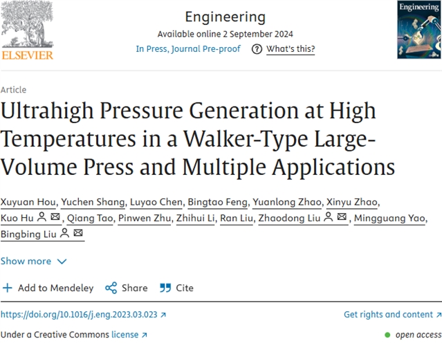 Xuyuan Hou, Yuchen Shang, Luyao Chen, Bingtao Feng, Yuanlong Zhao, Xinyu Zhao, Kuo Hu, Qiang Tao, Pinwen Zhu, Zhihui Li, Ran Liu, Zhaodong Liu, Mingguang Yao, Bingbing Liu. Ultrahigh Pressure Generation at High Temperatures in a Walker-Type Large-Volume Press and Multiple Applications. Engineering. https://doi.org/10.1016/j.eng.2023.03.023