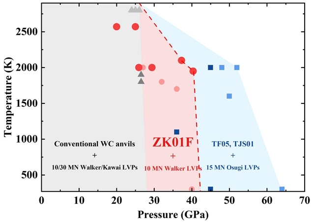 图. 不同压机构型及压砧达到的温度压力范围图。灰色三角形:常规碳化钨压砧与商用Kawai型或Walker型压机;浅红色圆圈:课题组前期工作标定的ZK01F型压砧在Walker型压机中达到的温度压力值;深红色圆圈:新型ZK01F压砧达到的温度压力值;深蓝色方块:TF05压砧在Osugi型压机中达到的温度压力值;浅蓝色方块:TJS01压砧在Osugi型压机中达到的温度压力值。