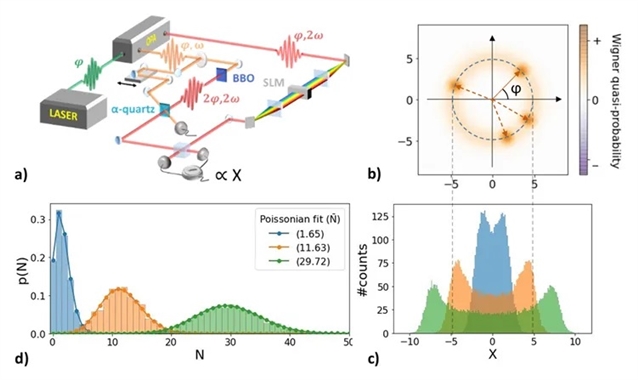团队首先详细展示了超快泵浦-探测相位随机化层析成像技术的实验装置以及其实现方式(如图2),该装置结合了光学参量放大器(OPA)、二次谐波生成(SHG)和相位随机化技术。实验中,OPA的信号光和差频光被调谐至共振频率,通过SHG过程生成相位随机化的探测脉冲。这种相位随机化利用了激光脉冲的自然载波包络相位(CEP)波动,避免了传统实验中对相位稳定性的严格要求,提高了测量的鲁棒性。此外实验通过测量相位平均的光学四象限分布,并利用最大似然算法重建光子数分布。