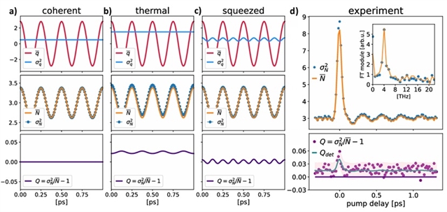 最后,研究团队进一步分析了光子数分布的平均值和方差随时间延迟的变化,并对比了不同的声子态(相干态、热态、压缩态)的理论模拟结果。对于相干态,光子数分布的方差与平均值接近,表现出泊松分布的特性,反映了系统的量子相干性;对于热态,方差大于平均值,表现出超泊松分布,反映了热激发下的经典噪声特征;对于压缩态,方差在某些时刻显著低于平均值,表现出亚泊松分布,反映了量子压缩特性。实验结果与理论模拟的相干态较为接近,表明在当前实验条件下,材料中的声子主要表现为相干激发,未观测到显著的量子压缩或热态特征,同时也证实该技术在区分不同的声子态的潜力(如图4)。