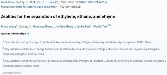 吉林大学化学学院闫文付教授等在《Frontiers of Chemical Science and Engineering》发表了题为“Zeolites for the separation of ethylene, ethane, and ethyne”(用于乙烯、乙烷和乙炔分离的沸石)的综述论文,系统梳理了沸石基吸附剂在C2H4/C2H6/C2H2分离中的研究进展,涵盖分离原理、材料设计、性能优化及工业应用前景,为低能耗分离技术开发提供了理论与实验依据。