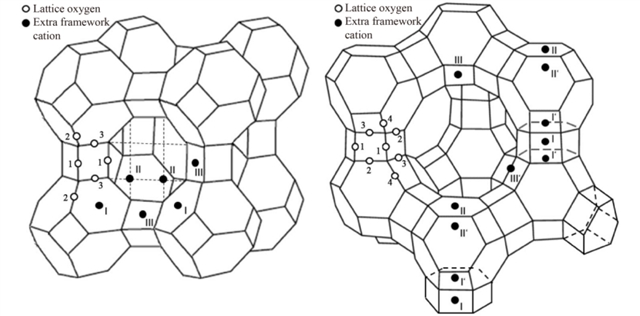图3 (左) A型沸石(LTA)的结构和(右)X型沸石(FAU)的结构。