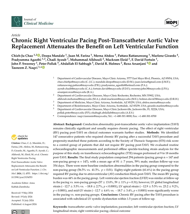 本研究对经导管主动脉瓣植入术 (Transcatheter Aortic Valve Replacement, TAVR) 后需要右心室起搏的患者与不需要右心室起搏的患者进行了长期随访,研究显示慢性右心室起搏可能致亚临床左室收缩功能障碍。
