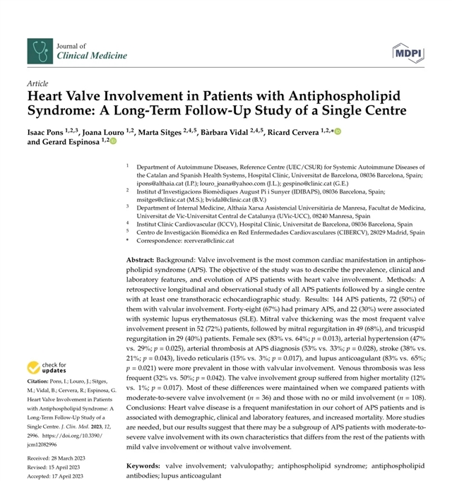 本研究对巴塞罗那某医院的自身免疫疾病专科接受治疗的所有抗磷脂抗体综合征 (Antiphospholipid Syndrome, APS) 患者进行回顾性观察研究,随访的纳入标准为至少接受过一次经胸超声心动图检查的患者。研究提示,中重度瓣膜病变可能构成具有独特临床特征的APS高危亚群。