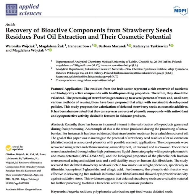 本文研究了草莓籽在超临界CO2油脂提取后的残渣,发现其仍富含多种低分子量酚类物质,并通过超声、微波等方法实现高效提取。实验进一步验证了提取物在成纤维细胞上的抗氧化与细胞保护作用,显示出其作为化妆品添加剂的应用潜力。