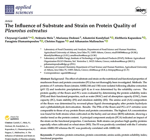 本文系统研究了两株平菇 (Pleurotus ostreatus) 在不同培养基质上的蛋白质品质差异,涵盖了蛋白质含量、氨基酸组成、蛋白溶解性指数及多种功能特性 (吸水性、吸油性、起泡性、乳化稳定性等) 的比较。结果显示,基质与菌株的差异对蛋白质的营养价值和功能特性均有显著影响,其中小麦秸秆有助于提升蛋白质浓缩物的品质,而大麦/燕麦秸秆则显著提高了氨基酸含量。进一步分析主成分表明,不同菌株与基质在蛋白质功能特性上的作用模式存在差异。