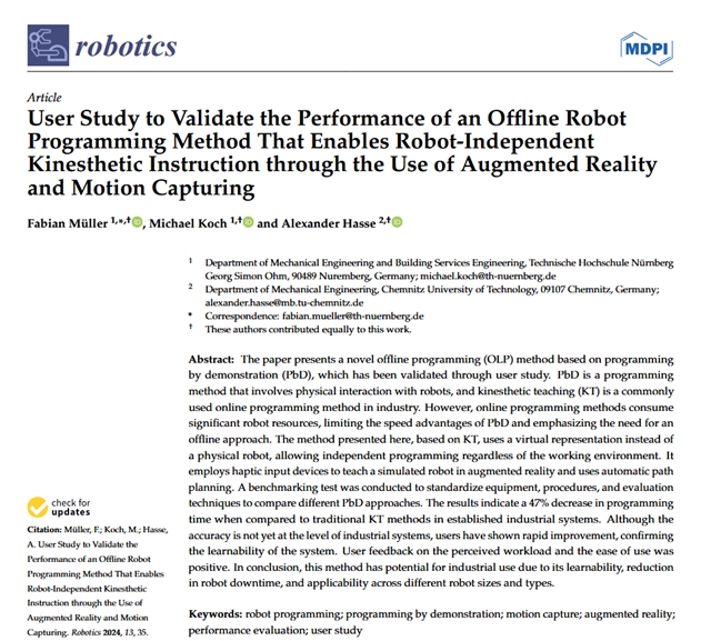 中文标题:一项离线机器人编程方法性能的用户研究——基于增强现实与动作捕捉技术,以实现机器人独立的动觉教学