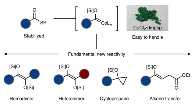 Abstract: α-Oxy-metallocarbenes exemplify Fischer carbenes and find use in the synthesis of diverse materials. Most, however, arise from the addition of reactive organometallics to toxic metal carbonyls. Here we report a method to access α-siloxycarbenes from thioesters via the reductive silylation of cobalt acyls. The reaction results in carbonyl dimerization with high hetero- and stereo-selectivity to yield unsymmetrical tetrasubstituted disiloxyalkenes, while avoiding competitive decarbonylation. These products can be further elaborated to new functionalized fragments, heterocycles and challenging enolsilanes. Several different reactivity patterns combined with mechanistic interrogation converge on α-oxycarbenes as fleeting catalytic intermediates, indicating a way to generate and exploit these reactive species under mild conditions. This method provides a general platform to harness carbene reactivity from carboxylates via metal acyls and enables a range of diverse reactivities.