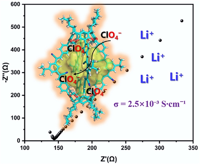 值得注意的是,该笼状结构能够选择性捕获高氯酸根阴离子。基于此阴离子捕获特性与多孔性质,研究组合理设计了一种以sp2c-POC3为主体、掺杂高氯酸锂的准固态电解质。该电解质在室温下表现出高达2.5×10-3 S cm-1的离子电导率。