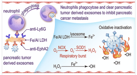 该系统通过中性粒细胞的吞噬活性清除外周血中的肿瘤外泌体,同时借助铁铝层状双氢氧化物增强的中性粒细胞呼吸爆发效应,对胞内外泌体内的肿瘤特异性生物分子产生氧化损伤,最终抑制胰腺导管腺癌的转移。该研究针对肿瘤外泌体这一关键转移驱动因子提出创新清除策略,以胰腺癌为范式为侵袭性恶性肿瘤的转移阻断提供了具有临床转化潜力的新途径。