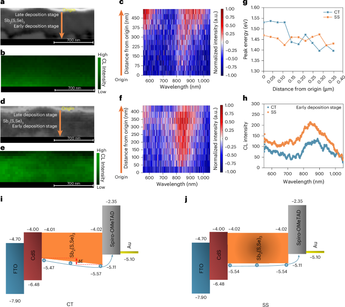 图3:横截面阴极发光(CL)光谱及能带边分布。a–c, CT 样品横截面的扫描电子显微镜(SEM)图像(a)、阴极发光(CL)分布图(b)以及沿起始点方向(由橙色箭头标示)的CL光谱(c)。d–f, SS样品横截面的扫描电子显微镜(SEM)图像(d)、阴极发光(CL)分布图(e)以及沿起始点方向(由橙色箭头标示)的CL光谱(f)。其中,a和d中橙色箭头的起点定义为Origin(起始点)。超薄横截面样品均通过聚焦离子束(FIB)制备。在b和e中,图像亮度对应于选定带通波长窗口内的CL强度。不同深度处获得的光谱线型叠加于同一图中,以直观展示峰位随深度变化的行为,详见补充图7和8。c 和 f中出现的高能峰源自CdS层。g, 由c和f中CL光谱提取的峰位能量。h, CT与SS样品在沉积早期阶段的CL光谱对比。i、j, CT(i)和SS(j)器件的能带边分布示意图。沉积早期的Sb2(S,Se)3薄膜通过将水热反应时间缩短至20 min制备,最终厚度约为20 nm。Sb2(S,Se)3的能带位置通过紫外光电子能谱(UPS)和UV–vis吸收光谱测定。蓝色带“+”号的圆点表示体内自由空穴,其需沿箭头方向传输并最终被Spiro-OMeTAD收集。ΔE表示在CT条件下由于价带顶(VBM)梯度引入的空穴传输能垒,该能垒在SS条件下消失。a.u. 表示任意单位。