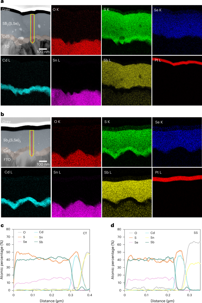 图2:元素分布。a、b, CT样品(a)和SS样品(b)的横截面TEM图像及对应的EDS元素分布图。c、d, 沿a、b图中黄色箭头方向得到的CT样品(c)和SS样品(d)的原子百分比随深度变化的分布曲线。横截面样品通过聚焦离子束(FIB)制备,监测的元素包括O、S、Se、Cd、Sn和Sb。