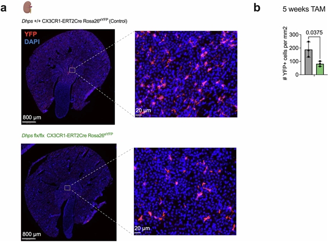 Abstract: Tissue-resident macrophages (RTMs) form during embryogenesis, self-renew locally, and regulate tissue homeostasis by clearing dead cells and debris1,2,3,4,5,6. During tissue damage, however, bone-marrow-derived monocytes enter tissues and differentiate into RTMs, repairing the tissue and replenishing macrophages in the niche1. The universal cell-intrinsic mechanisms that control the monocyte-to-RTM transition and the maintenance of mature RTMs across tissues remain elusive3. Here we show that deoxyhypusine synthase (DHPS), an enzyme that mediates spermidine-dependent hypusine modification of translation factor eIF5A5,7, is required for RTM differentiation and maintenance. Mice with myeloid cell lack of DHPS (Dhps-ΔM mice) had a global defect in RTMs across tissues, resulting in persistent but ultimately futile monocyte influx. Transcriptional analyses of DHPS-deficient macrophages indicated a block in their ability to differentiate into mature RTMs, whereas proteomics revealed defects in cell adhesion and signalling pathways. Sequencing of ribosome-engaged transcripts identified a subset of mRNAs involved in cell adhesion and signalling that rely on DHPS for efficient translation. Imaging of DHPS-deficient macrophages in tissues showed differences in morphology and tissue interactions, which were correlated with their failed RTM differentiation. DHPS-deficient macrophages were also defective in critical homeostatic RTM functions including efferocytosis and tissue maintenance. Together, our results demonstrate a cell-intrinsic, tissue-agnostic pathway that drives differentiation of monocyte-derived macrophages into RTMs.