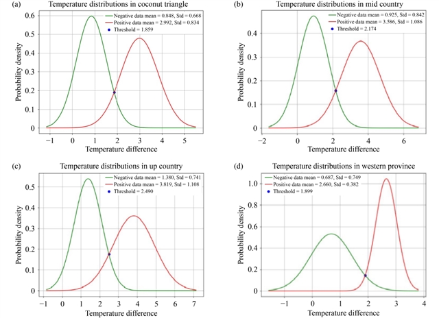 图2 斯里兰卡四个地区奶牛乳房温度分布的高斯曲线与阈值:(a) 中部地区,(b) 椰子三角区,(c) 高地地区,(d) 西部省。
