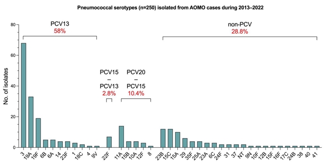 (1) 该研究通过分析希腊一儿童医院急性中耳炎伴耳漏(AOMO)患儿的病原学数据显示,肺炎球菌结合疫苗(PCV13)取代PCV7后,化脓性链球菌和流感嗜血杆菌成为AOMO主要病原体,肺炎球菌占比下降。