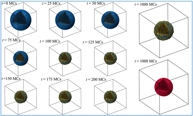 研究组采用粗粒度晶格蒙特卡洛框架模拟蒸发驱动的颗粒形成过程,探究内部空腔的形成机制。该模型通过在三维晶格系统中动态追踪固体珠迁移与溶剂蒸发,系统研究了固体珠尺寸与空腔形成能力对结构形成的影响。结果表明,较小的固体珠或增强的空腔形成能力会改变均匀堆积状态,促进固体结构间出现空腔与孔隙。所开发的方法使研究组能够从微观三维视角理解液滴干燥动力学,并将工艺参数与所得颗粒内部结构进行定量关联,这对于药物递送等应用中的颗粒功能性能至关重要。