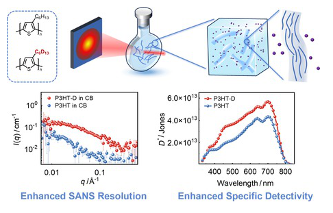 研究组通过选择性氘代聚(3-己基噻吩)(P3HT)的侧链制备出P3HT-D,显著提升了其中子散射长度密度。该同位素修饰使得聚合物:非富勒烯受体共混溶液中聚合物聚集行为的高对比度小角中子散射分析成为可能。增强的对比度克服了传统X射线散射与显微技术的局限性,能够明确解析链构象与聚集体结构。采用P3HT-D制备的光电二极管展现出更高的响应度,并实现了5.67×1013 Jones的比探测率。