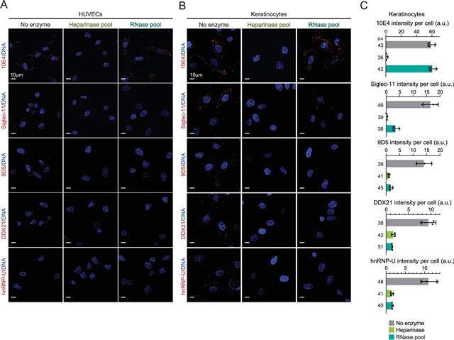 Abstract: Heparan sulfate proteoglycans (HSPGs) have been recognized as key plasma membrane-tethered co-receptors for a broad range of growth factors and cytokines containing cationic heparan-binding domains1,2. However, how HSPGs mechanistically mediate signalling at the cell surface—particularly in the context of cell surface RNA—remain poorly understood. During developmental and disease processes, vascular endothelial growth factor (VEGF-A), a heparan sulfate-binding factor, regulates endothelial cell growth and angiogenesis3. The regulatory paradigm for endothelial cell-mediated selectively of VEGF-A binding and activity has largely been focused on understanding the selective sulfation of the anionic heparan sulfate chains4,5,6,7,8. Here we examine the organizational rules of a new class of anionic cell surface conjugates, glycoRNAs9,10, and cell surface RNA-binding proteins (csRBPs11,12). Leveraging genome-scale knockout screens, we discovered that heparan sulfate biosynthesis and specifically the 6-O-sulfated forms of heparan sulfate chains are critical for the assembly of clusters of glycoRNAs and csRBPs (cell surface ribonucleoproteins (csRNPs)). Mechanistically, we show that these clusters antagonize heparan sulfate-mediated activation of ERK signalling downstream of VEGF-A. We demonstrate that the heparan sulfate-binding domain of VEGF-A165 is responsible for binding RNA, and that disrupting this interaction enhances ERK signalling and impairs vascular development both in vitro and in vivo and is conserved across species. Our study thus uncovers a previously unrecognized regulatory axis by which csRNPs negatively modulate heparan sulfate-mediated signalling in the context of angiogenesis driven by VEGF-A.