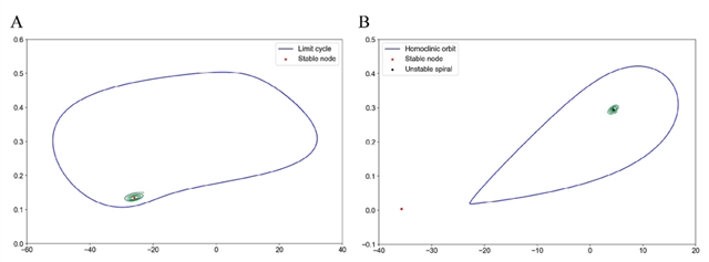 图 1:Morris-Lecar 模型相图(核心不变集可视化)A:稳定节点 + 稳定极限环,B:稳定节点 + 不稳定螺旋 + 稳定同宿轨道,直观展示模型多稳态特性,对应上述公式描述的动力学状态 。