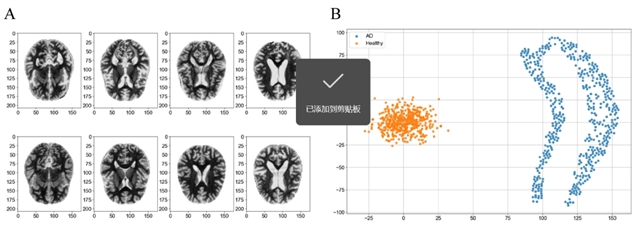 图 2:ADNI 数据对比与可视化。图A为健康 vs 轻度 AD 患者 MRI 样本,图B为 t-SNE 降维后的样本分布(橙色 = 健康,蓝色 = AD),直观展示数据差异。