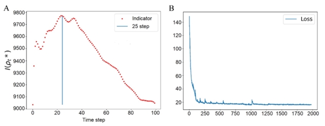 图4:预警指标与模型收敛曲线。左图为作用泛函指标随时间步变化,第 25 步达峰值(与图 3 突变完全对应);右图为损失函数收敛曲线,证明模型训练有效,结果可靠。