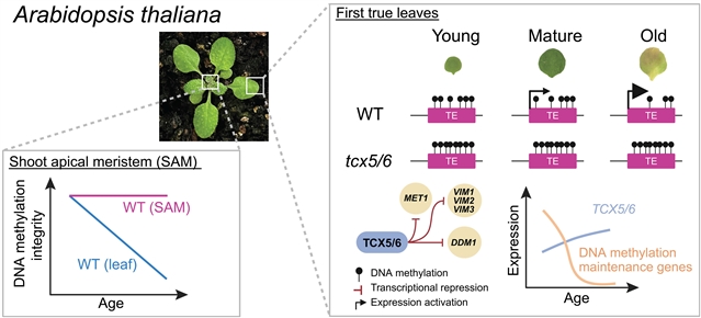Abstract: Plants display a wide range of life spans and aging rates. Although dynamic changes to DNA methylation are a hallmark of aging in mammals, it is unclear whether similar molecular signatures reflect rates of aging and organism life span in plants. In this work, we show that the short-lived model plant Arabidopsis thaliana exhibits a loss of epigenetic integrity during aging, which causes DNA methylation decay and the expression of transposable elements. We show that the rate of epigenetic aging can be manipulated by extending or curtailing life span and that shoot apical meristems are protected from these epigenetic changes. We demonstrate that a program of transcriptional repression suppresses DNA methylation maintenance pathways during aging and that mutants of this program display a complete absence of epigenetic decay while physical aging remains unaffected.