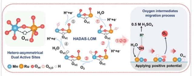 操作表征与理论计算表明,独特的Mn–Ovc–Ru单元中增强的Ru–O共价性与缩短的Ru–Mn距离,共同促成了异质不对称双活性位点辅助的晶格氧机制。在该机制中,O中间体从Ru位点转移至Mn位点,与晶格氧耦合实现快速O2释放。桥接的氧空位增加了Ru位点的电子密度以缓解过氧化,而Ru–Mn双位点的协同作用使得Mn周围的晶格氧(而非Ru周围的晶格氧)形成OO中间体,从而有效保护Ru免于溶解。这项工作为在酸性稳定高效析氧反应电催化剂设计中,构建氧空位与多重活性位点协同体系提供了新范式。