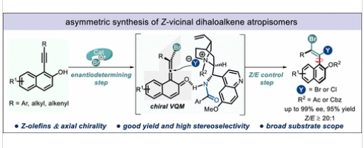 研究组报道了一种催化立体选择性合成高对映体富集的Z构型邻二卤烯烃阻转异构体的方法,该方法以高产率(高达95%)、优异的对映选择性(高达99%)和超过20:1的Z/E选择性实现转化。该转化是通过以易于获得的N-溴代丁二酰亚胺(NBS)和酰卤作为卤化试剂,经丙二烯介导的有机催化组装过程实现的。