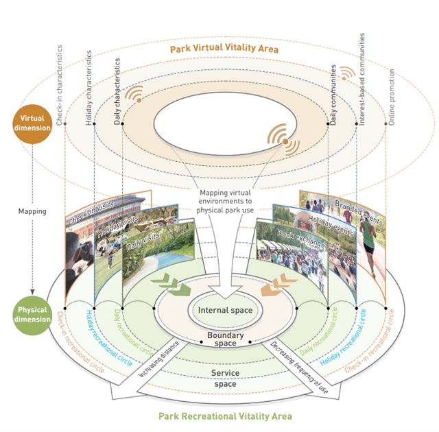 • 公园游憩活力圈构建路径包括内部空间活力提升、内外空间活力联动和网络空间活力社群培育
