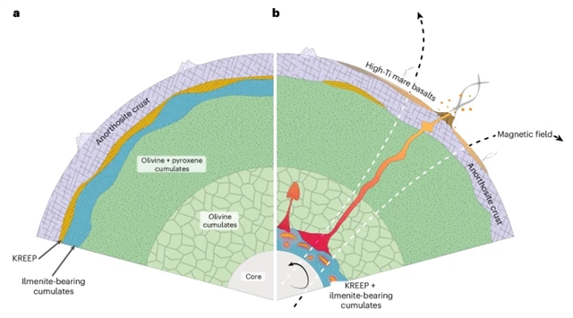 研究组通过整合已发表的月球玄武岩古强度、岩石磁学与地球化学数据,发现恢复的古强度值与月球玄武岩钛含量之间存在统计学显著的相关性。通过模拟核幔边界热通量,我们提出月球发电机效应与高钛玄武岩喷发之间存在成因联系——这种联系可能源于含钛铁矿堆晶岩在核幔边界的间歇性熔融。这些稀有事件的时空耦合,很可能反映了高钛玄武岩地体附近的采样偏差。