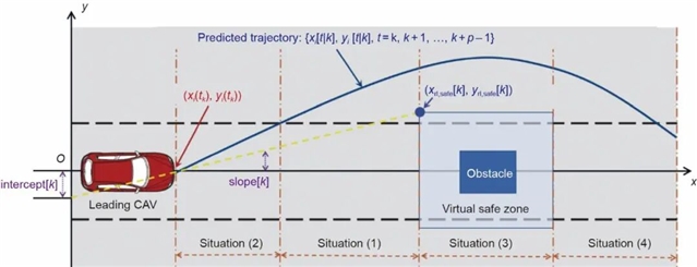 图2 领航CAV规避位于道路中央障碍物的典型场景。领航CAV需规避位于道路中央的障碍物,其规划轨迹将遵循“向左变道→超越障碍物→返回原车道”的行驶策略。为实现避障保障,车辆在预测轨迹各点处需始终位于该点与虚拟安全区域左上角连线的上方。