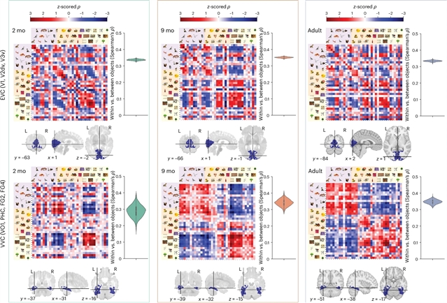 为此,课题组研究人员需要幼儿丰富的神经影像和应用先进的视觉计算模型的能力。在这项研究中,该课题组研究人员对100多名2个月大的婴儿进行了清醒功能磁共振成像(fMRI)研究,并在婴儿9个月大时进行随访。结果发现,在2月龄时,高级视觉皮层已存在类别结构。这早于类别结构在外侧视觉皮层的出现,表明类别表征的发展并非严格的层级递进模式。一个深度神经网络模型与婴儿的表征几何结构相吻合,表明构成婴儿类别模板的特征包含多种复杂度,并且可以从视觉输入的统计规律中习得。他们的研究结果揭示了2月龄婴儿腹侧视觉皮层已具备复杂功能,并描绘了类别感知能力的早期发展轨迹。
