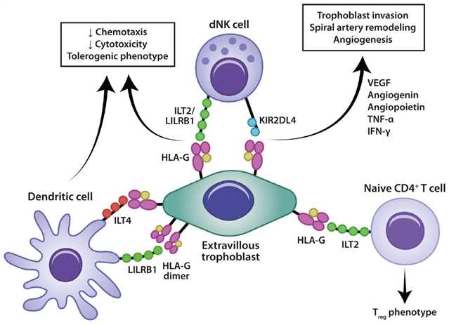 绒毛外滋养层(EVT)通过表达人类白细胞抗原 - G(HLA-G),与蜕膜自然杀伤细胞(dNK)表面的免疫球蛋白样转录本 2 / 白细胞免疫球蛋白样受体 B1(ILT2/LILRB1)、杀伤细胞免疫球蛋白样受体 2DL4(KIR2DL4)结合,降低 dNK 细胞细胞毒性并诱导其呈耐受表型;同时,HLA-G 通过 ILT2 调控初始 CD4+T 细胞分化为调节性 T 细胞(Treg),最终通过分泌血管内皮生长因子(VEGF)、肿瘤坏死因子 -α(TNF-α)等因子,支持滋养层侵袭、螺旋动脉重塑及血管生成,为胚胎着床提供耐受环境。