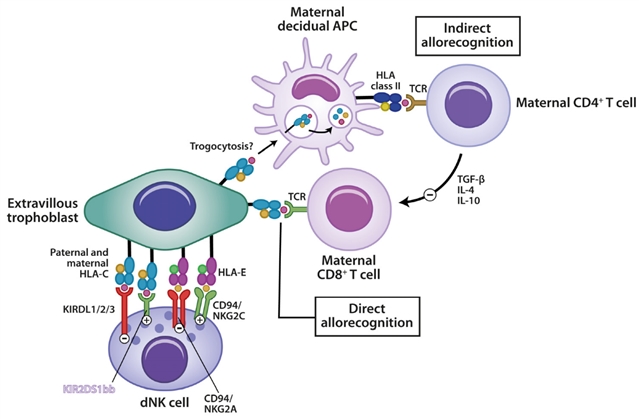 绒毛外滋养层(胎儿细胞)表达母源与父源人类白细胞抗原 - C(HLA-C)及非经典主要组织相容性复合体分子 HLA-E,分别与 dNK 细胞的 KIRDL1/2/3、CD94/NKG2A/NKG2C 受体结合,调控 dNK 细胞活性;同时,母体 CD8+T 细胞通过 T 细胞受体(TCR)直接识别滋养层 HLA 分子(直接同种异体识别),抗原提呈细胞(APC)则通过胞吞作用处理滋养层抗原,再经 HLA II 类分子呈递给 CD4+T 细胞(间接同种异体识别),诱导转化生长因子 -β(TGF-β)、IL-4、IL-10 等耐受型细胞因子分泌,共同维持母胎免疫耐受,支持着床与胎盘发育。