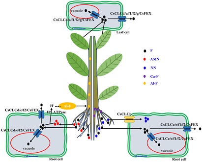 图1. NH4+-N促进H+的排出,激活Al的有效性,更多的Al-F被结合并运输到地上部,减轻了F对根系生长的抑制。在NO3--N处理过程中,根系积累了更多的钙,Ca-F结合在根系中积累,导致根系发育不良。此外,CsFEX和CsCLCe对F更敏感,CsCLCf1由NO3--N和F共同刺激,CsCLCf2对两种N形式的F运输都有反应,CsCLCb对NO3--N更敏感,NH4+-N诱导的H+变化分别刺激CsCLCd、CsCLCc和CsCLCg在根和叶中发挥作用。红圈:空泡;红点:NH4+;蓝点:NO3-;黑点:F−;蓝色圆柱体:F转运蛋白(CsFEX、CsCLCc/d/e/f1/f2/g);黄色圆柱体:硝酸盐氮转运蛋白CsCLCb。