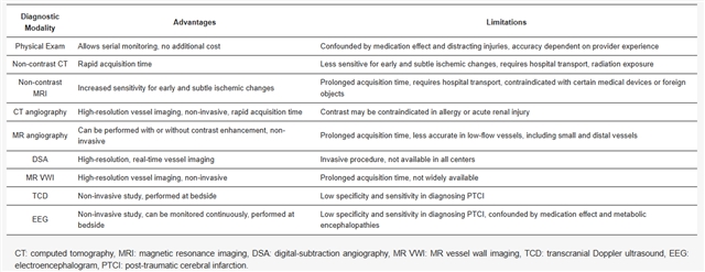 创伤后脑梗死的诊断采用与自发性急性缺血性卒中(AIS)类似的影像学检查方法,主要包括脑部非增强CT和MRI。虽然影像学检查对于解剖学特征的明确和确诊至关重要,但AIS的初步诊断通常是基于临床怀疑,例如神经系统状态的急性变化或神经功能未见改善。运动检查中的不对称可能明显,也可能不明显。由于危重患者常见的多种因素,例如创伤性、中毒性和代谢性脑病、镇静剂和镇痛剂的使用以及重症监护室(ICU)谵妄,导致格拉斯哥昏迷评分(GCS)较低,这常常会影响神经系统检查的准确性。此外,行为约束、导管和引流管以及卧床休息医嘱等物理障碍也会限制全面的神经系统检查,应在安全的情况下尽量减少这些障碍。下表总结了各种诊断方法及其临床注意事项和局限性。