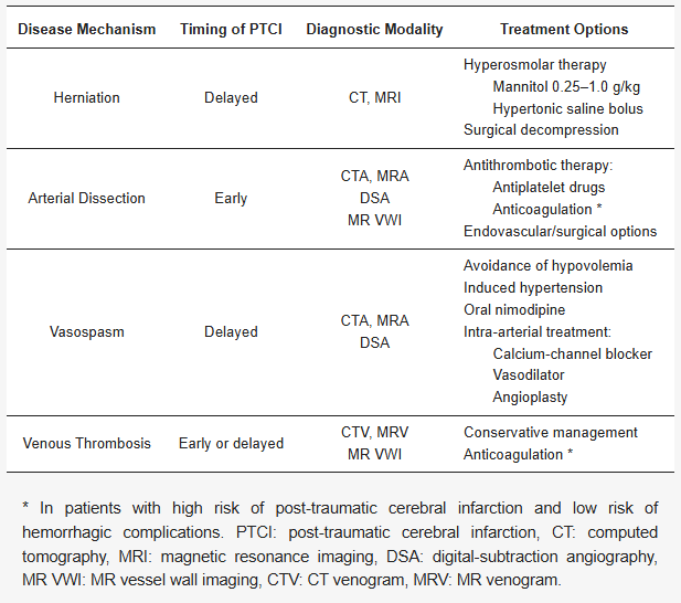 PTCI的最佳预防和治疗方案尚未确立。虽然高渗疗法可有效逆转脑疝,但针对PTV、CAD和CVST的国际标准化治疗方案仍缺乏。临床医生应优先预防TBI及AIS患者的继发性脑损伤。亟需新型诊疗手段改善该人群的治疗效果。