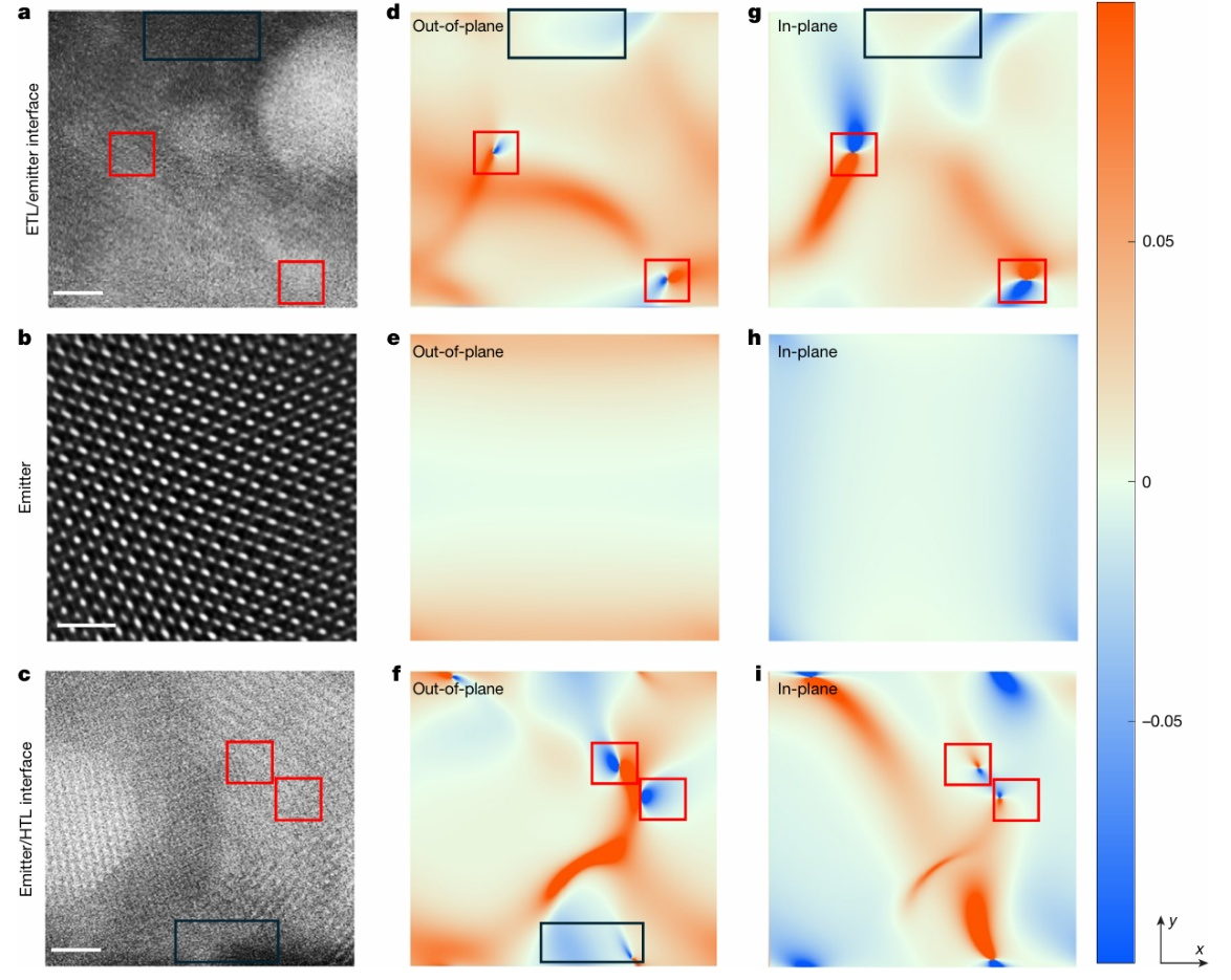 研究发现,在器件初始状态下,钙钛矿发光层中心区域总体保持较完整的正交相晶体结构,而靠近电子传输层和空穴传输层的界面区域则已存在明显的局域应变、晶格错配和富铅区域。进一步地,研究团队利用几何相位分析(GPA)对埋藏界面的局域晶格应变与结构畸变进行了定量表征。结果显示,在钙钛矿发光层与相邻功能层的界面处,晶格已出现显著的应变积累和局域畸变,表明器件在制备完成后,界面区域便已埋下潜在失稳前驱体。