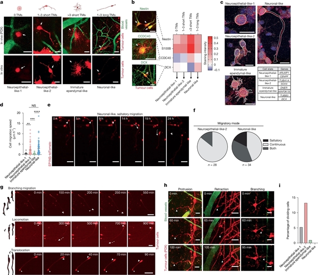 Abstract: Supratentorial ependymomas are aggressive childhood brain cancers that retain features of neurodevelopmental cell types1 and segregate into molecularly and clinically distinct subgroups2,3, suggesting different developmental roots. The developmental signatures, as well as microenvironmental factors, underlying aberrant cellular transformation and behaviour across each supratentorial ependymoma subgroup are unclear. Here we integrated single-cell and spatial transcriptomics, as well as in vitro and in vivo live-cell imaging, to define supratentorial ependymoma cell states, spatial organization and dynamic behaviour within the neural microenvironment. We find that individual tumour subgroups have two distinct progenitor-like cell states—neuroepithelial-like and embryonic-like—that are reminiscent of early human brain development and diverge in the extent of their neuronal or ependymal differentiation. We further identify several modes of spatial organization of these tumours, including a high-order architecture that is influenced by mesenchymal and hypoxia signatures, and local neighbourhood structures. Finally, we identify a role for brain-resident cells in shifting supratentorial ependymoma cellular heterogeneity towards neuronal-like cells that co-opt immature neuronal morphology and migratory mechanisms, and a subset of neuroepithelial-like cells that are both proliferative and highly migratory. Collectively, these findings provide a multidimensional framework to integrate transcriptional and phenotypic characterization of tumour heterogeneity in supratentorial ependymoma and its potential clinical implications.