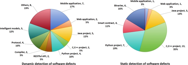 统计结果表明,在基于大语言模型的软件缺陷动态检测文献中,移动应用的GUI测试、智能模型的缺陷检测以及协议实现软件的测试占据了显著位置。然而,在使用大语言模型进行软件缺陷静态检测的文献中,其中大部分缺陷检测集中在C/C++、Python和Java项目上。总体而言,大语言模型在软件缺陷检测中覆盖了广泛的软件场景。随着大语言模型的理解和推理能力的持续进步,它们将为绝大多数软件缺陷检测场景提供支持,显著提升这一过程的效率。