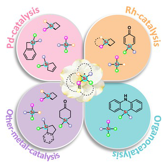 Abstract: Comprehensive SummarySilicon-stereogenic silacarbocycles constitute a privileged class of organosilicon compounds with wide-ranging applications in asymmetric synthesis, functional materials, and medicinal chemistry. This review provides a systematic overview of recent advances in catalytic enantioselective synthetic methods, organized by catalytic systems, and traces the evolution of key strategies—with particular emphasis on desymmetrization of prochiral precursors, alongside kinetic resolution (KR) and dynamic kinetic asymmetric transformation (DYKAT). The field was initially established through pioneering Pd-catalyzed transformations, notably the asymmetric ring-expansion of strained silacyclobutanes with alkynes—a fundamental methodology for constructing cyclic tetraorganosilicon stereocenters. Subsequently, Rh-catalyzed systems have emerged as highly versatile platforms, enabling diverse transformations including dehydrogenative C–H silylation for accessing monohydrosilanes and heterocycles, intramolecular hydrosilylation toward cyclic monohydrosilanes and spirosilabiindanes, and formal [2+2+2] cycloadditions for synthesizing dibenzosiloles and silaspiranes. Driven by economic and sustainability considerations, research has fruitfully expanded to encompass earth-abundant base metal catalysis. Ni-catalyzed systems facilitate efficient intramolecular aryl transfer and ring-expansion reactions, while Co- and Cu-catalyzed approaches enable sequential hydrosilylation cascades that construct silacycles bearing consecutive Si and C stereocenters. Concurrently, metal-free organocatalysis has emerged as a powerful sustainable alternative, with chiral N-heterocyclic carbenes (NHCs), chiral phosphoric acids (CPAs), enamine catalysts, and confined imidodiphosphorimidates (IDPi) demonstrating remarkable efficacy in enantioselective desymmetrization processes. Despite substantial progress, we also offer a critical perspective on current methodologies, outline existing challenges and limitations, and highlight promising directions for future research. Current limitations include reliance on elaborate prochiral substrates and historical dependence on precious metals. Future efforts should focus on developing more efficient and atom-economical substrate synthesis, expanding sustainable catalytic systems including base-metal, organo-, and biocatalysis, integrating emerging technologies such as photocatalysis and electrocatalysis, and deepening mechanistic understanding to enable the rational design of advanced strategies such as DYKAT.Key ScientistsIn 2011, Hayashi and Shintani reported a pioneering Pd-catalyzed asymmetric ring expansion of silacyclobutanes with alkynes, enabling the construction of cyclic tetraorganosilicon stereocenters and marking the inception of this field. Subsequently, Takai and coworkers developed a Rh-catalyzed asymmetric synthesis of chiral spirosilabifluorene through sequential Si–H and C–H bond activations. In 2015, Nozaki and Shintani developed an efficient Rh-catalyzed [2+2+2] cycloaddition for the highly enantioselective synthesis of Si-stereogenic dibenzosiloles. In 2018, Xu and colleagues established a Pt-catalyzed tandem hydrosilylation/cyclization, and in 2022, the same group made further breakthroughs in the Rh-catalyzed dynamic kinetic asymmetric hydrosilylation to access Si-stereogenic benzosiloles. Meanwhile, the Song group developed a Rh-catalyzed ring expansion of silacyclobutanes with alkynes, expanding the methodologies for synthesizing axially chiral spirosilanes. In 2021, He et al. made an important contribution through Rh-catalyzed C–H silylation, enabling the enantioselective synthesis of Si-stereogenic monohydrosilanes and various heterocycles. Concurrently, the group of Wang conducted impressive studies on Rh-catalyzed asymmetric hydrosilylation and established a kinetic resolution strategy for the efficient synthesis of Si-stereogenic cyclic monohydrosilanes. More recently, Zhao reported a base-metal-catalyzed intramolecular ring expansion and an Ir-catalyzed enantioselective C–H silylation for constructing Si-stereogenic silacarbocycles, thereby further broadening the catalyst scope in this area. Numerous other researchers have also made important contributions; however, due to space constraints, a comprehensive acknowledgment of all achievements is not feasible within this review.
