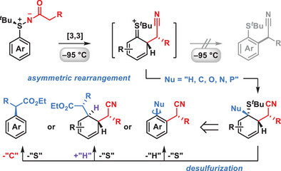 Abstract: The aromatic Claisen rearrangement transiently generates dearomatized intermediates that are generally too unstable to be intercepted and thus undergo spontaneous rearomatization. In this study, we demonstrate that this otherwise inevitable rearomatization can be effectively suppressed, thereby enabling asymmetric dearomative dual functionalization. Specifically, we have developed an asymmetric dehydrative rearrangement of chiral aryl sulfimides that proceeds at exceptionally low temperature (95 °C), providing a unique window to intercept the highly unstable dearomatized intermediates in situ. A wide array of nucleophiles—including enol silyl ethers, organozinc reagents, and heteroatom nucleophiles—proved competent in capturing these intermediates, affording dual-functionalized dearomatization products with up to four contiguous stereocenters. Remarkably, these dearomatization products undergo three distinct desulfurization pathways, furnishing structurally diverse chiral products featuring both axial and point chirality. Computational studies reveal the mechanistic divergence from the conventional rearomatization pathway to the present dearomatization manifold and uncover the origin of the high fidelity in continuous chirality transfer.