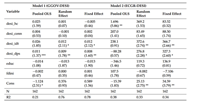 分析显示,数字技术整合(desi_idt)和数字公共服务(desi_dps)作为 DESI 的核心维度,对欧盟国家的治理质量和经济增长均产生显著正向影响,有力支持了研究提出的两大假设。具体而言: