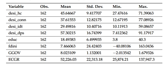 研究选取数字经济与社会指数(DESI)的四大核心维度作为关键解释变量,包括人力资本(desi_hc,衡量数字技能水平)、连通性(desi_conn,评估宽带基础设施与网络质量)、数字技术整合(desi_idt,考察企业数字化技术应用程度)、数字公共服务(desi_dps,衡量电子政务与电子健康等服务质量);以世界银行数据库中的治理质量综合指数(GGOV,通过因子分析整合腐败控制、法治、政府效能等六大维度)和人均 GDP(ECGR,衡量长期经济增长)作为被解释变量;同时纳入高等教育毕业率(educ)、外国直接投资净流入占 GDP 比重(fdini)作为控制变量。