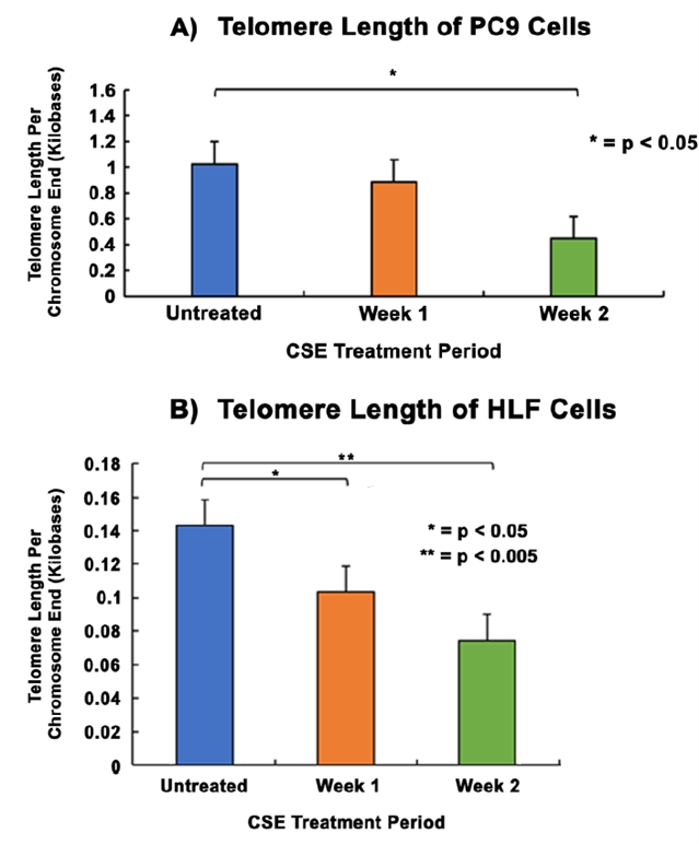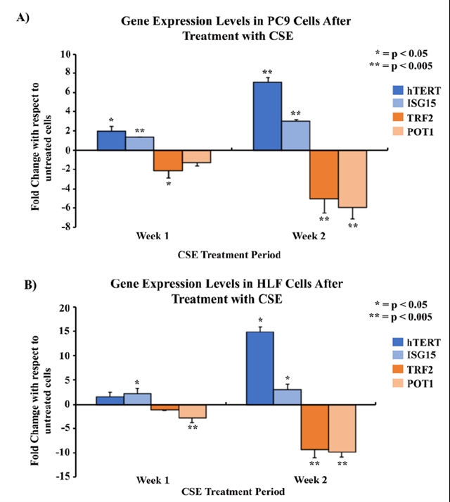 图1. 香烟烟雾提取物 (CSE) 处理PC9和HLF细胞2周的hTERT、ISG15、TRF2和POT1基因表达水平差异 (左);CSE处理2周后PC9和HLF细胞的端粒长度变化 (右)。