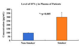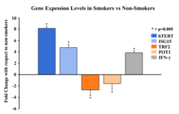 图2. 比较临床样本 (11名吸烟者和20名非吸烟者的全血和口腔拭子) 的端粒长度、相关基因和炎症核心蛋白IFN-γ表达水平。