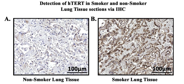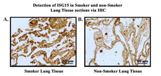 图3. 通过免疫组化方法 (IHC) 检测吸烟组和非吸烟组肺组织切片中的ISG15 (左) 和hTERT (右) 蛋白表达水平。