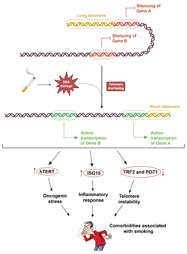 端粒缩短是细胞衰老及癌症等多种年龄相关疾病的公认生物标志物。大多数癌细胞的端粒短于正常细胞,但当端粒缩短至临界长度时,会触发端粒酶的异常激活。这一机制使癌细胞逃脱复制性衰老,获得无限分裂能力,导致细胞“永生化”。研究表明,端粒酶 (尤其是其催化亚基hTERT) 在超过85%的人类癌症中高表达,因而被视为癌症的关键标志物。吸烟已被证实可加速端粒缩短,并显著增加癌症等疾病风险,然而其背后的分子机制尚未完全明确。鉴于全球约有13亿吸烟者,深入揭示吸烟如何通过影响端粒进而促进衰老以及相关疾病 (如癌症、慢性炎症),具有重要的科学及公共卫生意义。2024年发表于Cells的研究论文“The Effects of Smoking on Telomere Length, Induction of Oncogenic Stress, and Chronic Inflammatory Responses Leading to Aging”,旨在系统探讨这一机制路径。