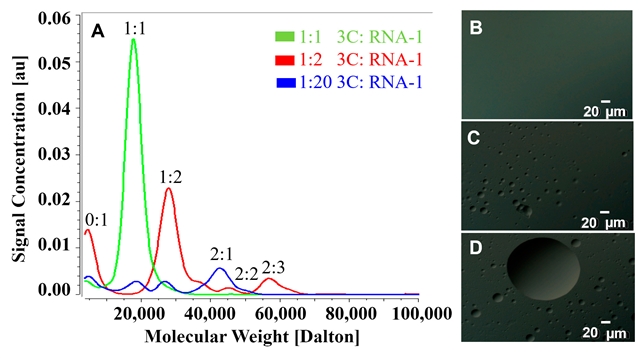 通过AUC分析型超速离心技术,检测3C蛋白与RNA-1在不同化学计量比下的组装状态(图2)。结果显示,在1:1比例下,体系主要形成单一复合物;当RNA比例提高至1:2及以上时,体系中逐渐出现沉降系数分布范围更宽的高分子量组分,表明形成了从二聚到多聚的连续组装体。该数据直观证实了蛋白与RNA之间存在化学计量依赖性的多价相互作用,即单个3C蛋白分子可同时结合多个RNA链,为后续LLPS的发生提供了分子聚集基础。