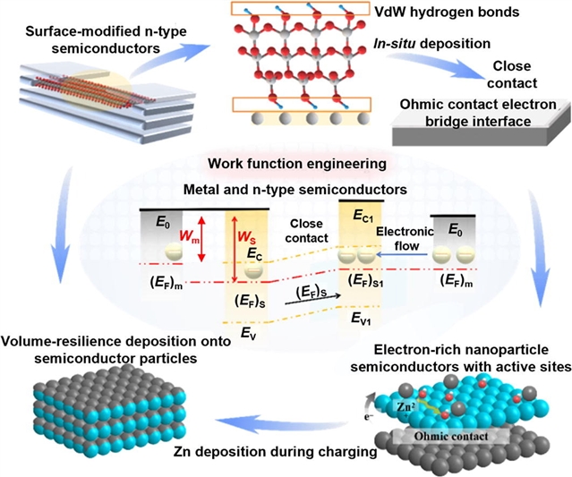 Abstract: The development of highly stable zinc (Zn) anodes under high discharge depth (DOD) is crucial for the practical application of aqueous zinc metal batteries (AZMBs). However, the disordered plating/stripping behavior of Zn metal anodes caused by localized electron accumulation or depletion at the interface significantly hinders their practicality under high areal capacity conditions. This work reports a work-function-guided chemical interface for Zn anodes with high area capacity. Induced by the interfacial work-function difference, the ohmic contact constructs an electron bridge during band alignment. This electron transport provides abundant reaction sites for uniform Zn2+ plating/stripping at the interface, suppressing the cracking of the interface. As a result, the designed interface ensures stable cycling at a capacity of 30 mAh cm2 (52% DOD) and 50 mAh cm2 (85% DOD) without obvious interfacial morphology deterioration. As a practical validation, a 370 mAh Zn||iodine (Zn||I2) pouch cell operates effectively at a remarkable areal capacity of 4.625 mAh cm2, highlighting the advancement of interface design in a specific electron transport mode for practical anode performance.